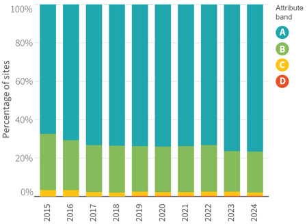 Over the past 10 years, the proportion of sites in each band has remained relatively stable (Figure 4).