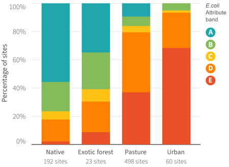 Figure 13. Comparison of attribute bands for the faecal indicator bacteria E. coli across four different land cover classes. Bands were calculated from data over a five-year hydrological period (July 2019–June 2024) at 773 sites. The number of sites with suitable data to determine an attribute band for each land cover class are shown below each bar. The location and attribute band of monitoring sites are shown on the map.